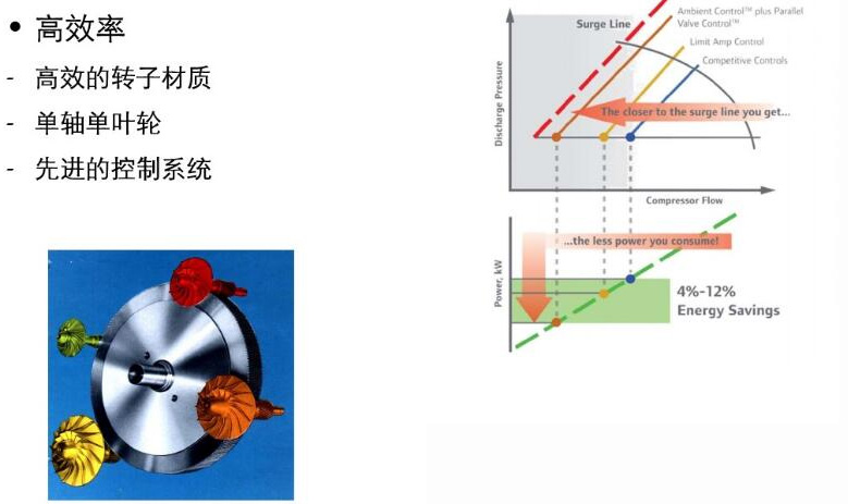 典型的單軸單葉輪設(shè)計縮短了轉(zhuǎn)子的長度,使懸臂的重量減至最小,從而使轉(zhuǎn)子組合具有最佳的穩(wěn)定性。葉輪與擴(kuò)壓器之間的工作間隙不受空氣或水溫變化影響。半開式三元流后彎型葉輪(由英格索蘭公司最先開發(fā))使機(jī)組具有最佳的控制能力,同時使運(yùn)行范圍最大CENTAC葉輪由特殊的高級鑄造不銹鋼經(jīng)密加壓鑄造一次成型,具有高強(qiáng)度和耐腐蝕的特點(diǎn)。 推力環(huán)有效地將氣動推力分散傳遞至機(jī)殼上,使主齒輪不承受該負(fù)載,最大程度地延長了齒輪的壽命。獨(dú)特的圓弧三角形短軸確保了推力環(huán),葉輪與小齒輪之間牢固的自鎖連接,并使拆裝極為簡便。這種圓弧三角形的連接方式還增加了接觸面積,較之鍵連接或熱套連接,使用壽命更長。